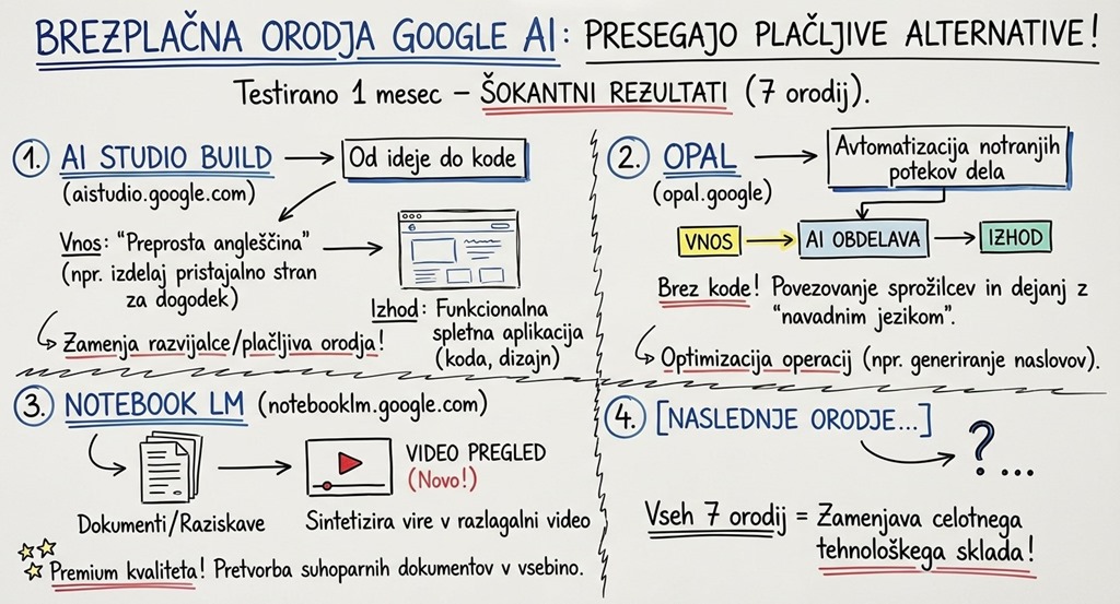 Google je v zadnjem letu izdal niz brezplačnih AI orodij, ki po kakovosti resno tekmujejo z drago SaaS konkurenco v razponu 20–50 USD na mesec. V tem članku so predstavljena ključna orodja, ki vam omogočajo razvoj aplikacij, avtomatizacijo procesov, produkcijo videov, predstavitev, slik in večgovornega avdia – brez dodatnih licenčnin.