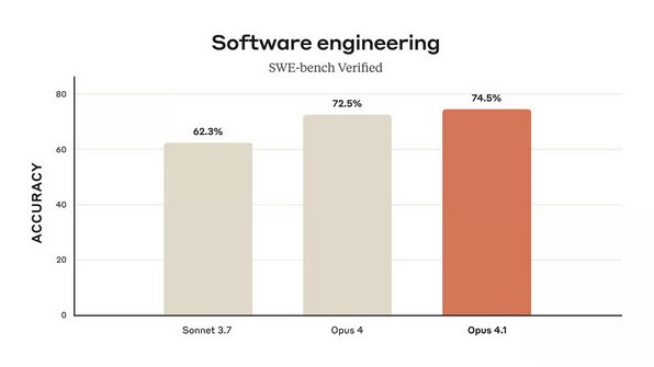 Najvišja ocena na področju kodiranja: Claude 4.1 dosega 74,5 % na testu SWE-bench Verified, kar je njegova najvišja ocena doslej in pomeni pomemben napredek v primerjavi s prejšnjimi različicami.