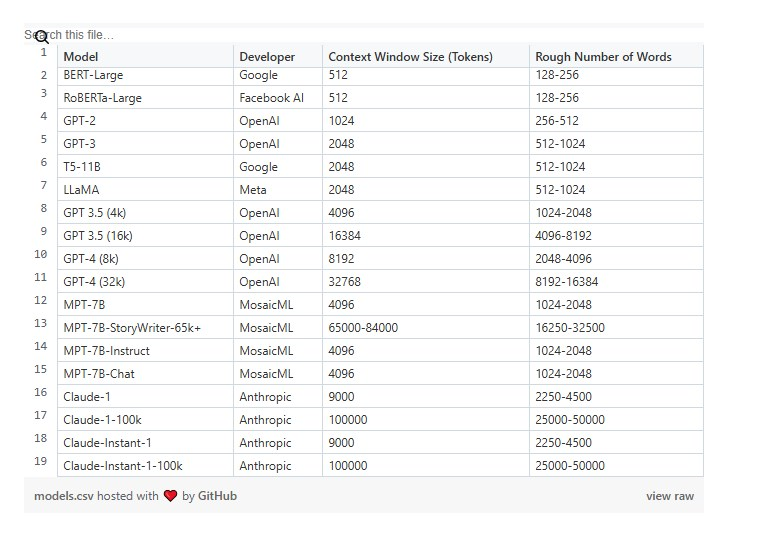 Model,Developer,Context Window Size (Tokens),Rough Number of Words