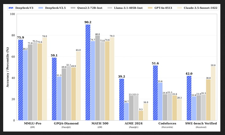 Zmogljivost in učinkovitost: DeepSeek-R1 je v ključnih testih dosegel rezultate, ki so primerljivi ali celo boljši od modela GPT-3 od OpenAI. Dosegel je visoke rezultate na matematičnih in programerskih izzivih, kar kaže na njegovo vsestranskost in sposobnost sklepanja na različnih področjih.