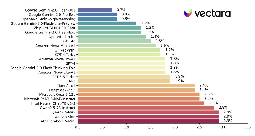 Lestvica LLM, izračunana z uporabo Vectarinega modela za vrednotenje Hughesovih halucinacij. Ta ocenjuje, kako pogosto program LLM pri povzemanju dokumenta uvaja halucinacije.