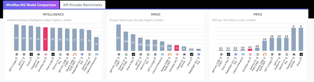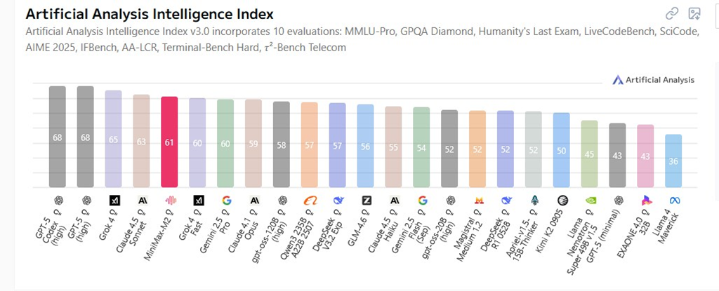 Inteligenca: MiniMax-M2 ima višjo inteligenco v primerjavi s povprečjem, z indeksom inteligence Artificial Analysis 61.