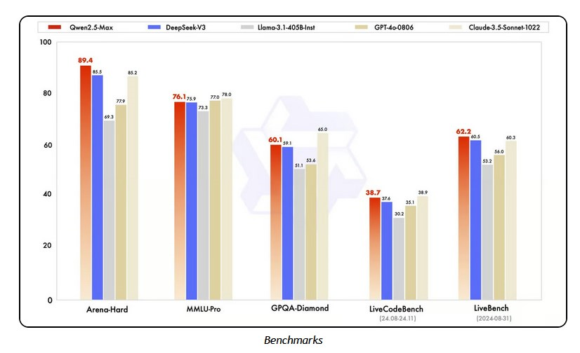 - V primerjavi z drugimi velikimi odprtokodnimi modeli, kot sta Llama 3.1-405B in DeepSeek V3, Qwen 2.5-Max dosega boljše rezultate na testih, kot so Arena-Hard, LiveBench in MMLU-Pro.
