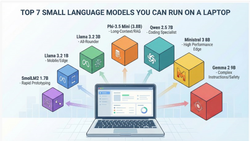 Članek predstavi 7 majhnih jezikovnih modelov (SLM), ki realno tečejo na običajnih prenosnikih, z jasnim fokusom na praktične use-case scenarije, ne benchmarke.